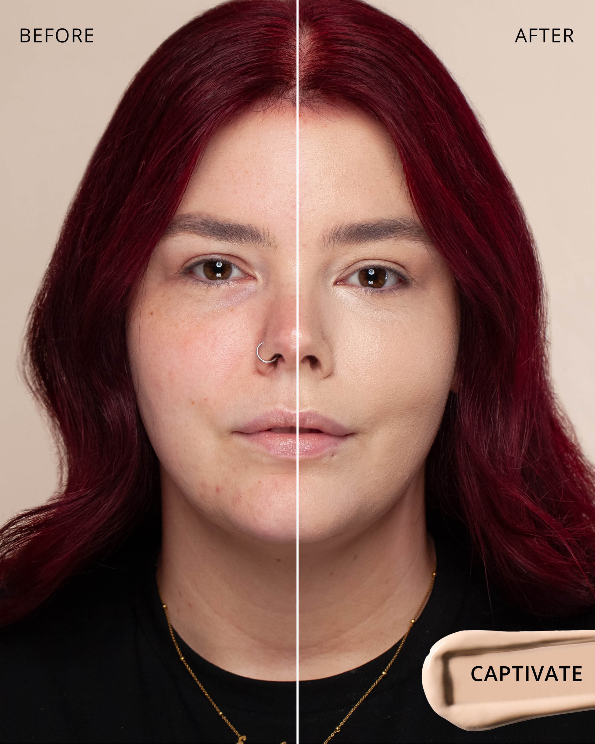 Captivate : Water, Dimethicone, Butylene Glycol Dicaprylate/Dicaprate, Titanium Dioxide (CI 77891), Diphenylsiloxy Phenyl Trimethicone, Glycerin, Synthetic Fluorphlogopite, Cetyl PEG/PPG-10/1 Dimethicone, Trisiloxane, Butylene Glycol, 1,2-Hexanediol, Iron Oxides (CI 77492), Trimethylsiloxysilicate, Disteardimonium Hectorite, PEG-10 Dimethicone, Lactobacillus Ferment, Polyphenylsilsesquioxane, Magnesium Sulfate, Dimethicone Crosspolymer, Lauroyl Lysine, Triethoxycaprylylsilane, Aluminum Hydroxide, Iron Oxides (CI 77491), Polyhydroxystearic Acid, Phenyl Trimethicone, Hydrogenated Polyisobutene, Iron Oxides (CI 77499), Lecithin, Ethylhexyl Palmitate, Isopropyl Myristate, Isostearic Acid, Lauryl Polyglyceryl-3 Polydimethylsiloxyethyl, Dimethicone, Chenopodium Quinoa Seed Extract, Trisodium Ethylenediamine Disuccinate, Polyglyceryl-3 Polyricinoleate, Disodium Stearoyl Glutamate, Polyglyceryl-3 Polydimethylsiloxyethyl, Dimethicone, Caprylyl Methicone, Neopentyl Glycol Diethylhexanoate, Ethylhexylglycerin