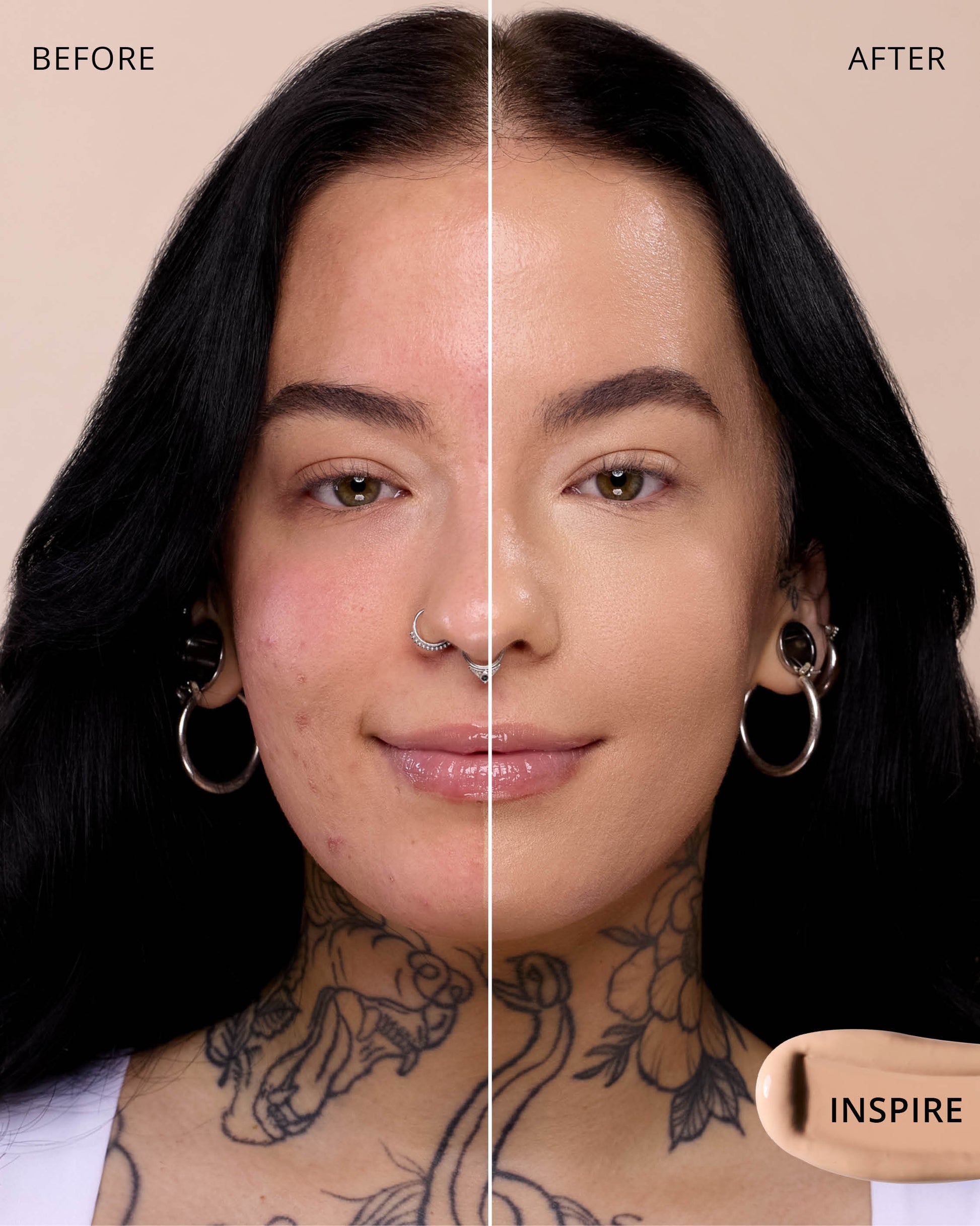 Inspire : Water, Dimethicone, Butylene Glycol Dicaprylate/Dicaprate, Titanium Dioxide (CI 77891), Diphenylsiloxy Phenyl Trimethicone, Glycerin, Synthetic Fluorphlogopite, Cetyl PEG/PPG-10/1 Dimethicone, Trisiloxane, Butylene Glycol, Iron Oxides (CI 77492), 1,2-Hexanediol, Trimethylsiloxysilicate, Disteardimonium Hectorite, PEG-10 Dimethicone, Lactobacillus Ferment, Polyphenylsilsesquioxane, Magnesium Sulfate, Dimethicone Crosspolymer, Lauroyl Lysine, Iron Oxides (CI 77491), Triethoxycaprylylsilane, Aluminum Hydroxide, Polyhydroxystearic Acid, Iron Oxides (CI 77499), Lecithin, Phenyl Trimethicone, Hydrogenated Polyisobutene, Polyglyceryl-3 Polydimethylsiloxyethyl, Dimethicone, Ethylhexyl Palmitate, Isopropyl Myristate, Isostearic Acid, Chenopodium Quinoa Seed Extract, Trisodium Ethylenediamine Disuccinate, Polyglyceryl-3 Polyricinoleate, Lauryl Polyglyceryl-3 Polydimethylsiloxyethyl, Dimethicone, Disodium Stearoyl Glutamate, Caprylyl Methicone, Neopentyl Glycol Diethylhexanoate, Ethylhexylglycerin