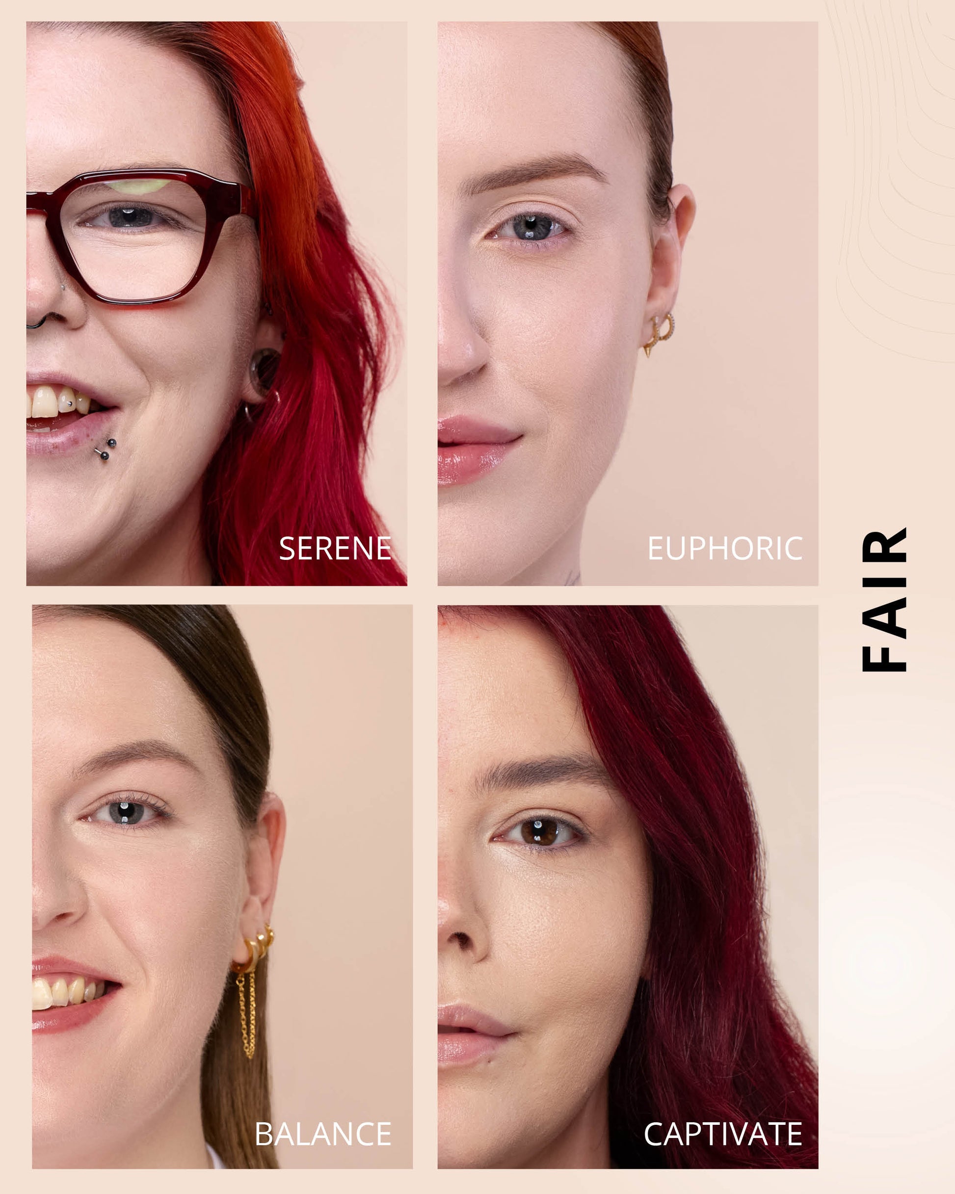 Serene : Water, Dimethicone, Titanium Dioxide (CI 77891), Butylene Glycol Dicaprylate/Dicaprate, Diphenylsiloxy Phenyl Trimethicone, Glycerin, Synthetic Fluorphlogopite, Cetyl PEG/PPG-10/1 Dimethicone, Trisiloxane, Butylene Glycol, 1,2-Hexanediol, Trimethylsiloxysilicate, Disteardimonium Hectorite, PEG-10 Dimethicone, Lactobacillus Ferment, Polyphenylsilsesquioxane, Magnesium Sulfate, Dimethicone Crosspolymer, Lauroyl Lysine, Iron Oxides (CI 77492), Triethoxycaprylylsilane, Aluminum Hydroxide, Polyhydroxystearic Acid, Iron Oxides (CI 77491), Lecithin, Iron Oxides (CI 77499), Polyglyceryl-3 Polydimethylsiloxyethyl, Dimethicone, Ethylhexyl Palmitate, Isopropyl Myristate, Isostearic Acid, Chenopodium Quinoa Seed Extract, Trisodium Ethylenediamine Disuccinate, Polyglyceryl-3 Polyricinoleate, Hydrogenated Polyisobutene, Phenyl Trimethicone, Caprylyl Methicone, Lauryl Polyglyceryl-3 Polydimethylsiloxyethyl, Dimethicone, Neopentyl Glycol Diethylhexanoate, Disodium Stearoyl Glutamate, EthylhexylglycerinEuphoric : Water, Dimethicone, Titanium Dioxide (CI 77891), Butylene Glycol Dicaprylate/Dicaprate, Diphenylsiloxy Phenyl Trimethicone, Glycerin, Synthetic Fluorphlogopite, Cetyl PEG/PPG-10/1 Dimethicone, Trisiloxane, Butylene Glycol, 1,2-Hexanediol, Trimethylsiloxysilicate, Disteardimonium Hectorite, PEG-10 Dimethicone, Lactobacillus Ferment, Polyphenylsilsesquioxane, Magnesium Sulfate, Dimethicone Crosspolymer, Lauroyl Lysine, Iron Oxides (CI 77492), Triethoxycaprylylsilane, Aluminum Hydroxide, Iron Oxides (CI 77491), Polyhydroxystearic Acid, Lecithin, Polyglyceryl-3 Polydimethylsiloxyethyl, Dimethicone, Ethylhexyl Palmitate, Isopropyl Myristate, Isostearic Acid, Chenopodium Quinoa Seed Extract, Trisodium Ethylenediamine Disuccinate, Polyglyceryl-3 Polyricinoleate, Iron Oxides (CI 77499), Hydrogenated Polyisobutene, Phenyl Trimethicone, Lauryl Polyglyceryl-3 Polydimethylsiloxyethyl, Dimethicone, Caprylyl Methicone, Neopentyl Glycol Diethylhexanoate, Disodium Stearoyl Glutamate, Ethylhexylglycerin