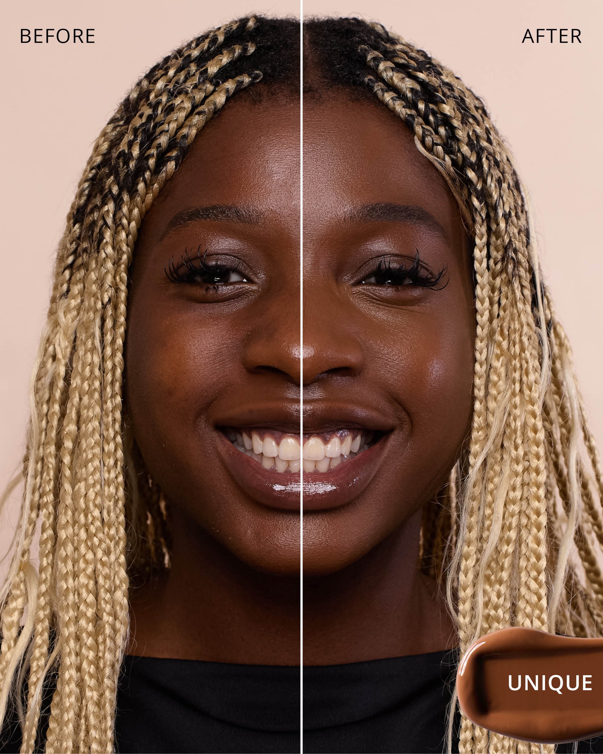 Unique : Water, Dimethicone, Butylene Glycol Dicaprylate/Dicaprate, Diphenylsiloxy Phenyl Trimethicone, Iron Oxides (CI 77492), Glycerin, Iron Oxides (CI 77491), Cetyl PEG/PPG-10/1 Dimethicone, Iron Oxides (CI 77499), Trisiloxane, Butylene Glycol, 1,2-Hexanediol, Titanium Dioxide (CI 77891), Synthetic Fluorphlogopite, Trimethylsiloxysilicate, Caprylyl Methicone, Disteardimonium Hectorite, PEG-10 Dimethicone, Lactobacillus Ferment, Polyphenylsilsesquioxane, Magnesium Sulfate, Dimethicone Crosspolymer, Lauroyl Lysine, Triethoxycaprylylsilane, Polyhydroxystearic Acid, Lecithin, Hydrogenated Polyisobutene, Ethylhexyl Palmitate, Isopropyl Myristate, Isostearic Acid, Lauryl Polyglyceryl-3 Polydimethylsiloxyethyl, Dimethicone, Aluminum Hydroxide, Chenopodium Quinoa Seed Extract, Trisodium Ethylenediamine Disuccinate, Polyglyceryl-3 Polyricinoleate, Phenyl Trimethicone, Polyglyceryl-3 Polydimethylsiloxyethyl, Dimethicone, Disodium Stearoyl Glutamate, Ethylhexylglycerin, Neopentyl Glycol Diethylhexanoate