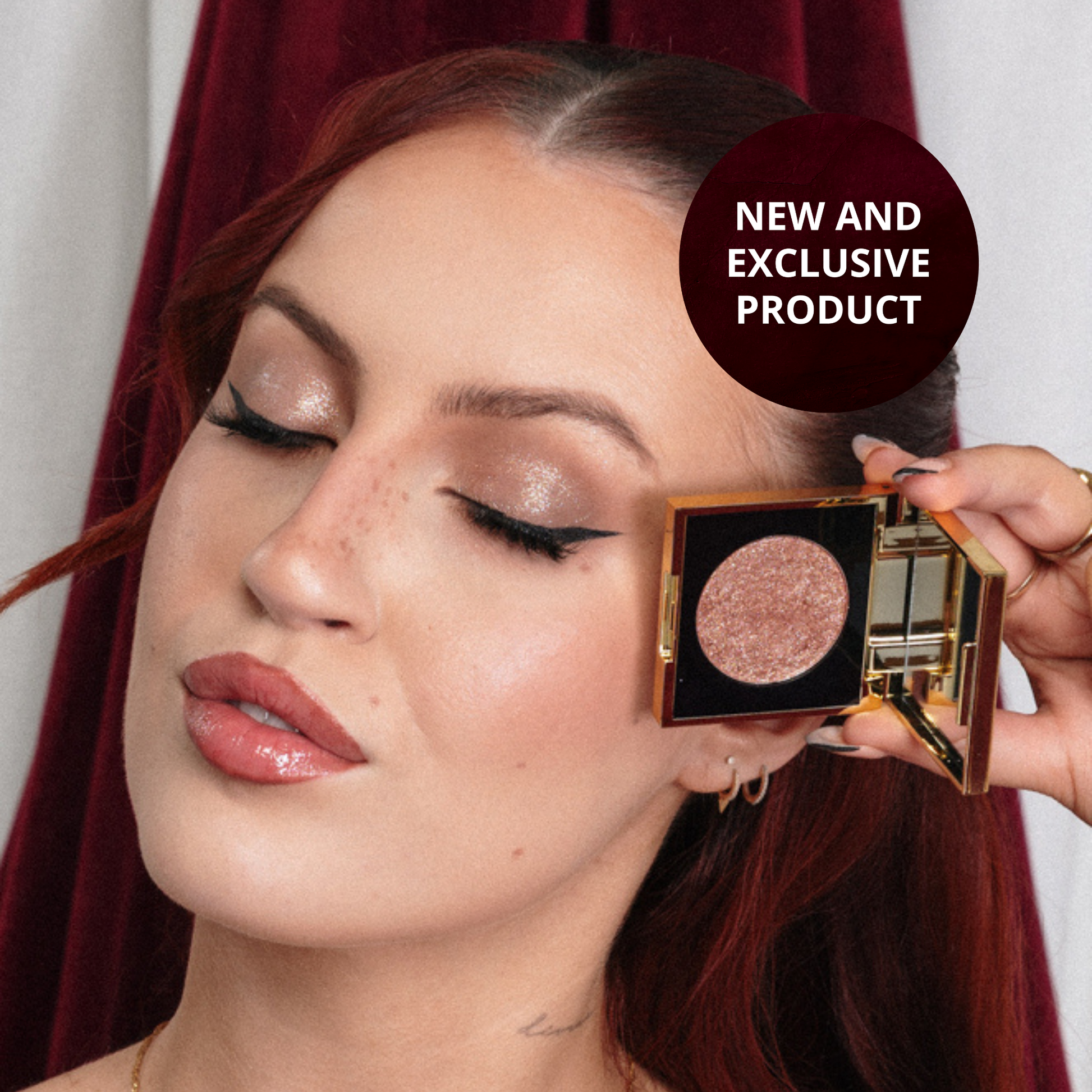 Our brand-new Glitter Glaze shade, Vogue, is a rich bronze-copper shimmer packed with glimmering particles that catch the light, setting your looks ablaze. Top with the Adore Lash to create the perfect sultry eye. Liquid Silk is a versatile face and body illuminator. It has a slight base colour, working especially well over fake tan. Gold Beam is the perfect shade to add a sunkissed tint to your skin. Top it all off with a swipe of Starlight Lipgloss, a crystal-clear gloss swirled with pretty rose-gold glitter particles. You’ll be party-ready in an instant!